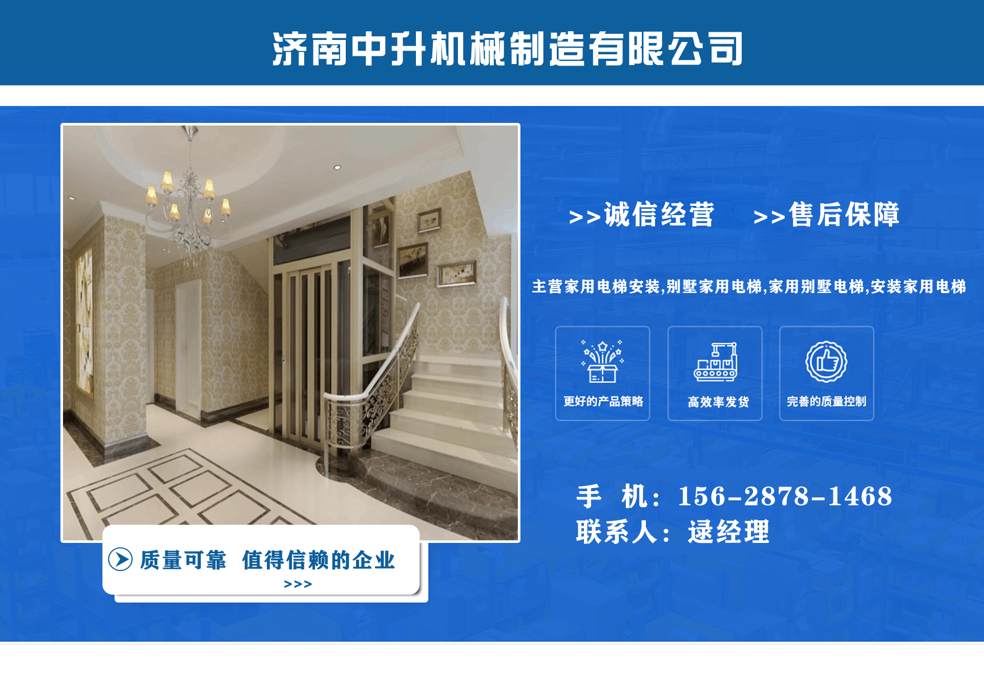 濟(jì)南中升機(jī)械制造有限公司主營(yíng)家用電梯安裝,別墅家用電梯,家用別墅電梯,安裝家用電梯等業(yè)務(wù),質(zhì)量可靠,值得信賴! 公司為客戶提供免費(fèi)上門測(cè)量,根據(jù)實(shí)際情況1對(duì)1服務(wù),保障符合用戶需求,終身提供售后服務(wù),讓用戶買的舒心用的放心。匠心團(tuán)隊(duì),打造信賴產(chǎn)品,我們有團(tuán)結(jié)、奮進(jìn)拼搏的匠心團(tuán)隊(duì),為您提供可信賴的品質(zhì)保證。 從創(chuàng)立以來一直嚴(yán)格執(zhí)行質(zhì)量管理體系、環(huán)境管理體系等相關(guān)標(biāo)準(zhǔn)管理體系,“顧客滿意”是我們始終如一的追求。我們有屬于自己培養(yǎng)的安裝隊(duì)伍,24小時(shí)服務(wù)電話,為您提供可靠的服務(wù)與支持。 我們的愿景是建設(shè)國(guó)內(nèi)具有影響力的電梯公司,做城市美好空間的好伙伴。...